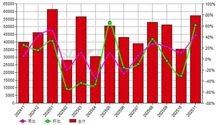 2025年11月份中國(guó)電熔鎂砂出口量57,302.92公噸,去年同期為39,937.91公噸,上月為35,481.07公噸,同比上漲43.48%,環(huán)比上漲61.50%。