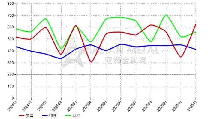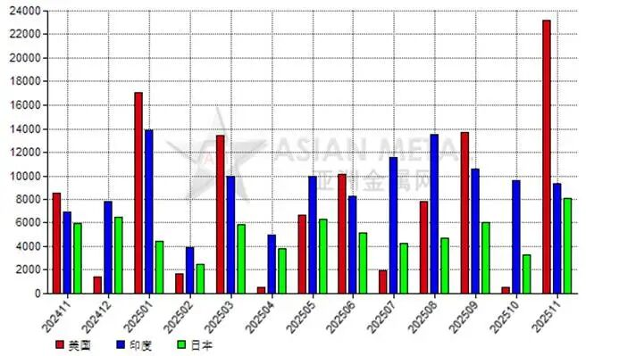 2025年11月,中國(guó)電熔鎂砂前三大出口目的國(guó)為美國(guó)、印度和日本。