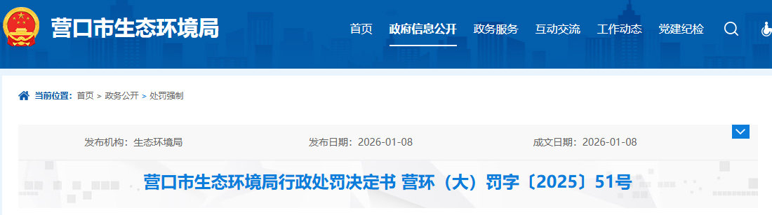 營口市環(huán)保整改一直在持續(xù)進(jìn)行中,就在近日,營口市生態(tài)環(huán)境局在官網(wǎng)發(fā)出公告,對南樓經(jīng)濟(jì)開發(fā)區(qū)一輕燒氧化鎂生產(chǎn)企業(yè)環(huán)境違法行為的行政處罰進(jìn)行了公示。