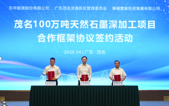 會(huì)上,廣東茂名濱海新區(qū)管理委員會(huì)、東華能源股份有限公司、華礦實(shí)業(yè)投資集團(tuán)有限公司有關(guān)負(fù)責(zé)同志共同簽署《茂名100萬噸天然石墨深加工項(xiàng)目合作框架協(xié)議書》。