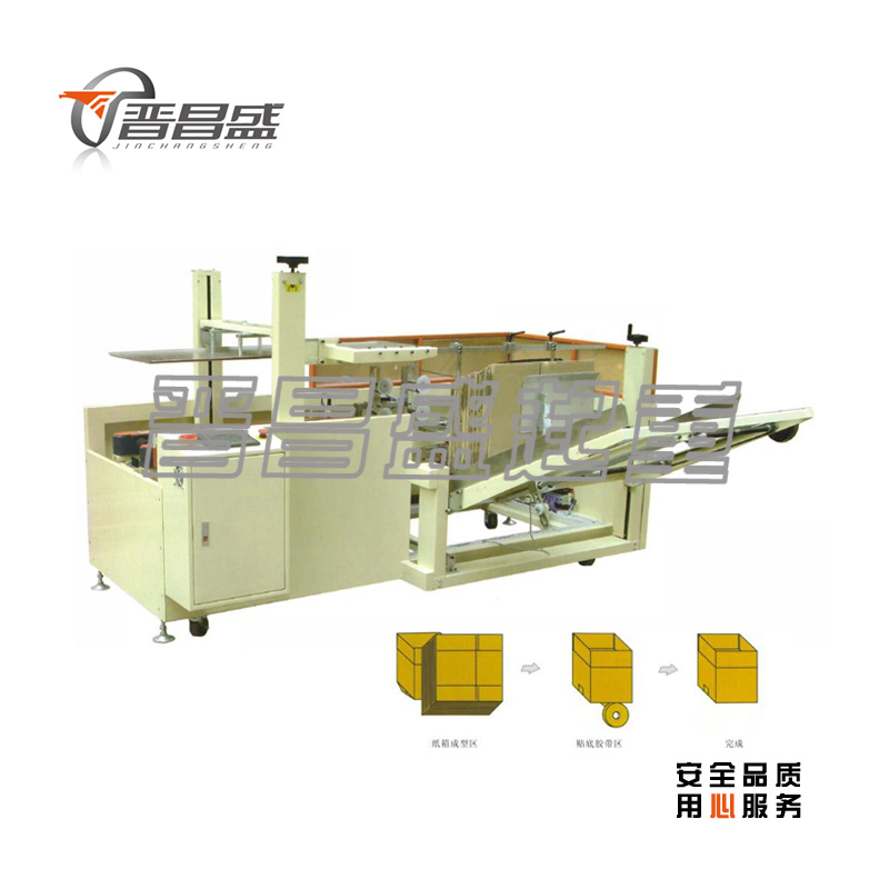 自動完成開箱、成形、下底折葉折曲。并現(xiàn)時(shí)完成下部分膠帶粘貼,將疊成紙板的箱板自動打開,箱子底部按一定程序折合,并用膠帶密封后輸送給裝箱機(jī)的專用設(shè)備。
