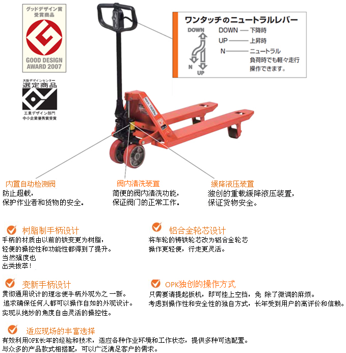OPK獨(dú)創(chuàng)的油泵結(jié)構(gòu),單觸式的空擋杠桿,負(fù)荷時(shí)也可輕松操作行駛。